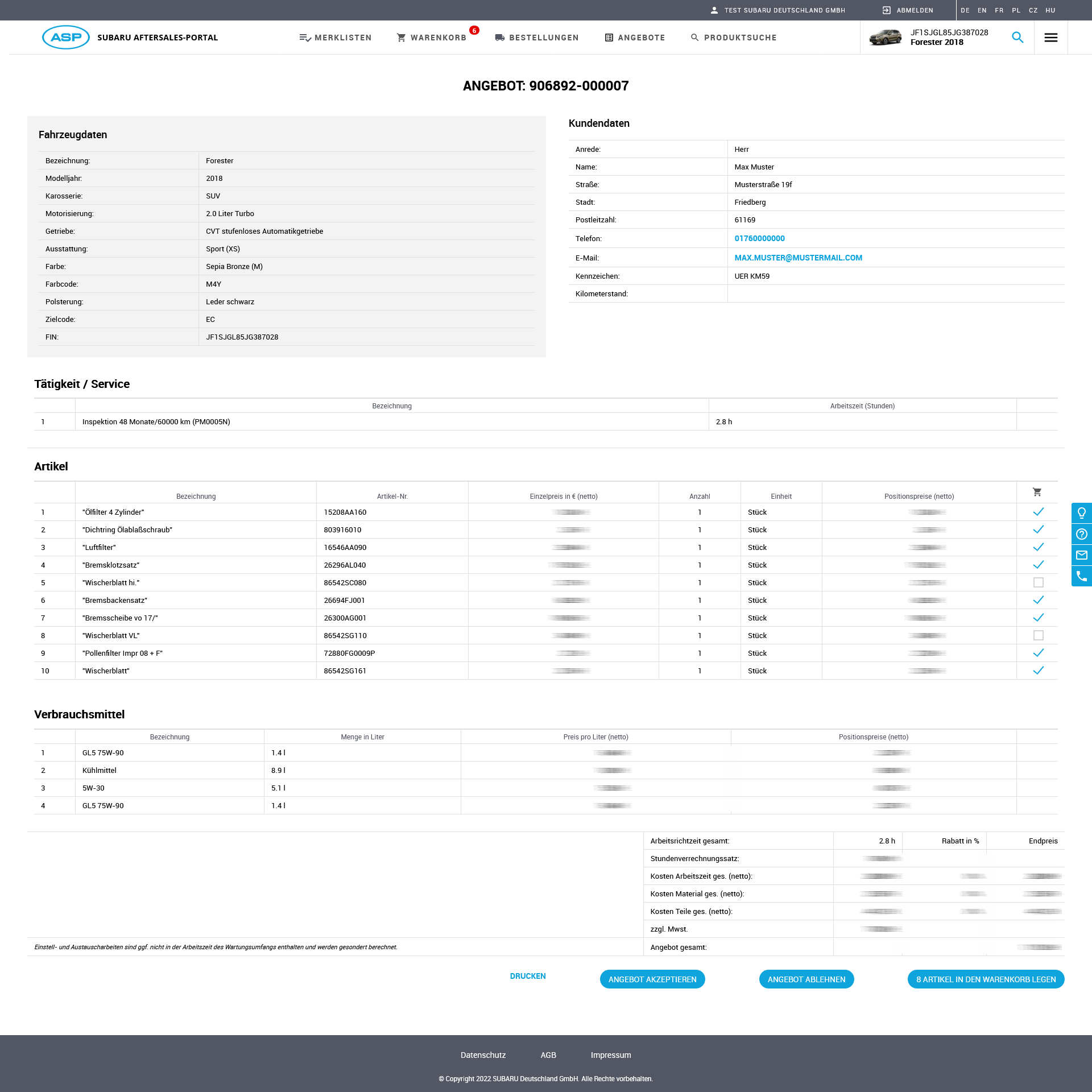 Mit dem Aftersales Portal können die Partner einheitliche Subaru-gebrandete Endkundenangebote erstellen. Dabei profitieren sie von der hohen Vernetztheit unserer Daten. Ein Angebot wird komplett kalkuliert, u.a. mit diesen Funktionen:
