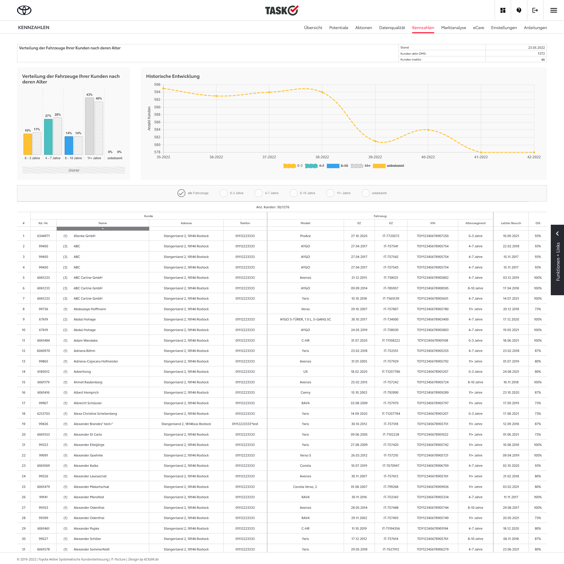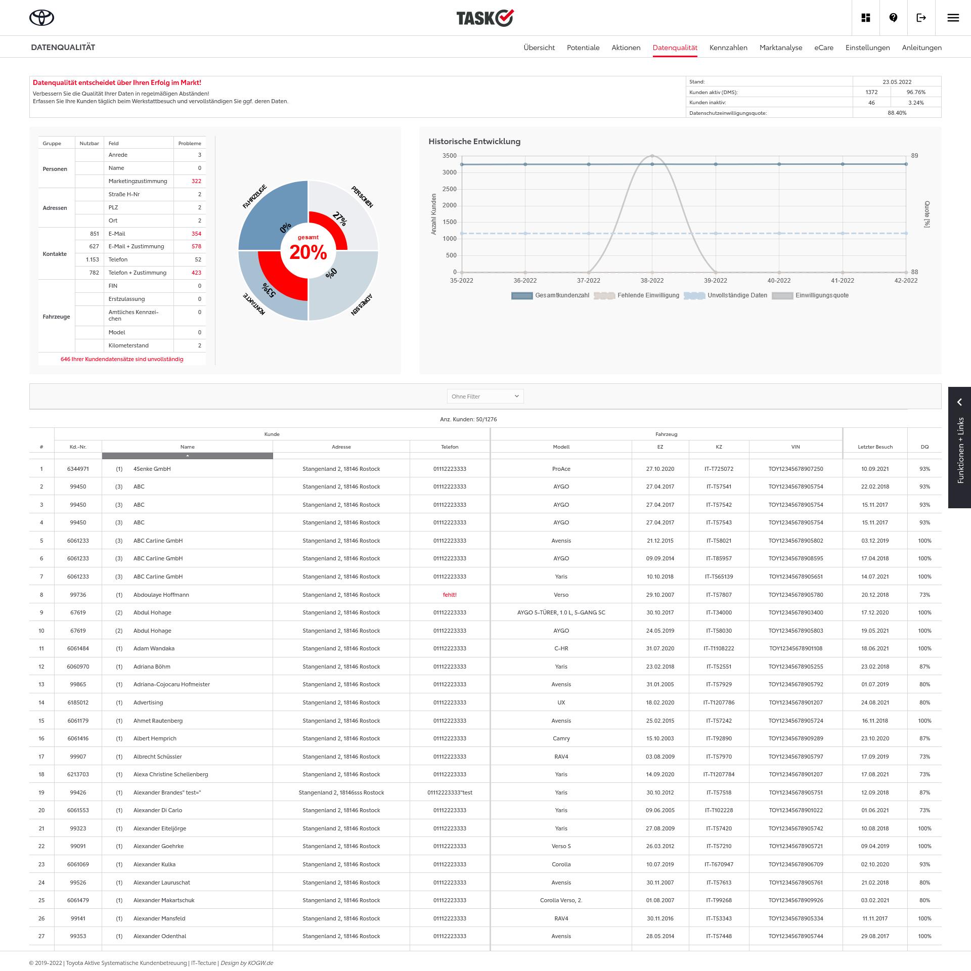 In TASK werden die Kunden- Fahrzeuge und Werkstattdaten des Händlers verarbeitet und analysiert. Im Bereich Datenqualität kann der Händler Fehler in der Datenpflege erkennen, dann die Prozesse im Autohaus anpassen und sich die Auswirkungen dann in TASK auch in der zeitlichen Entwicklung ansehen.