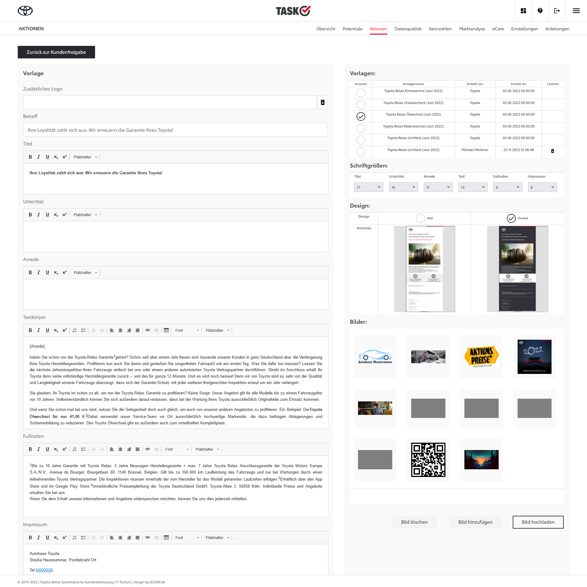 TASK steht für „Toyota aktive systematische Kundenbetreuung“ im Aftersales und bietet den Toyota Händlern eine Plattform, um Kunden einfach und passgenau anzusprechen. Dafür erhalten sie Unterstützung durch die zentral zur Verfügung gestellten Inhalte und der automatischen Erfolgsmessung, die für jeden Kundenkontakt integriert ist. Anschreiben per E-Mail- + Brief sind zu 100% integriert und automatisierbar.