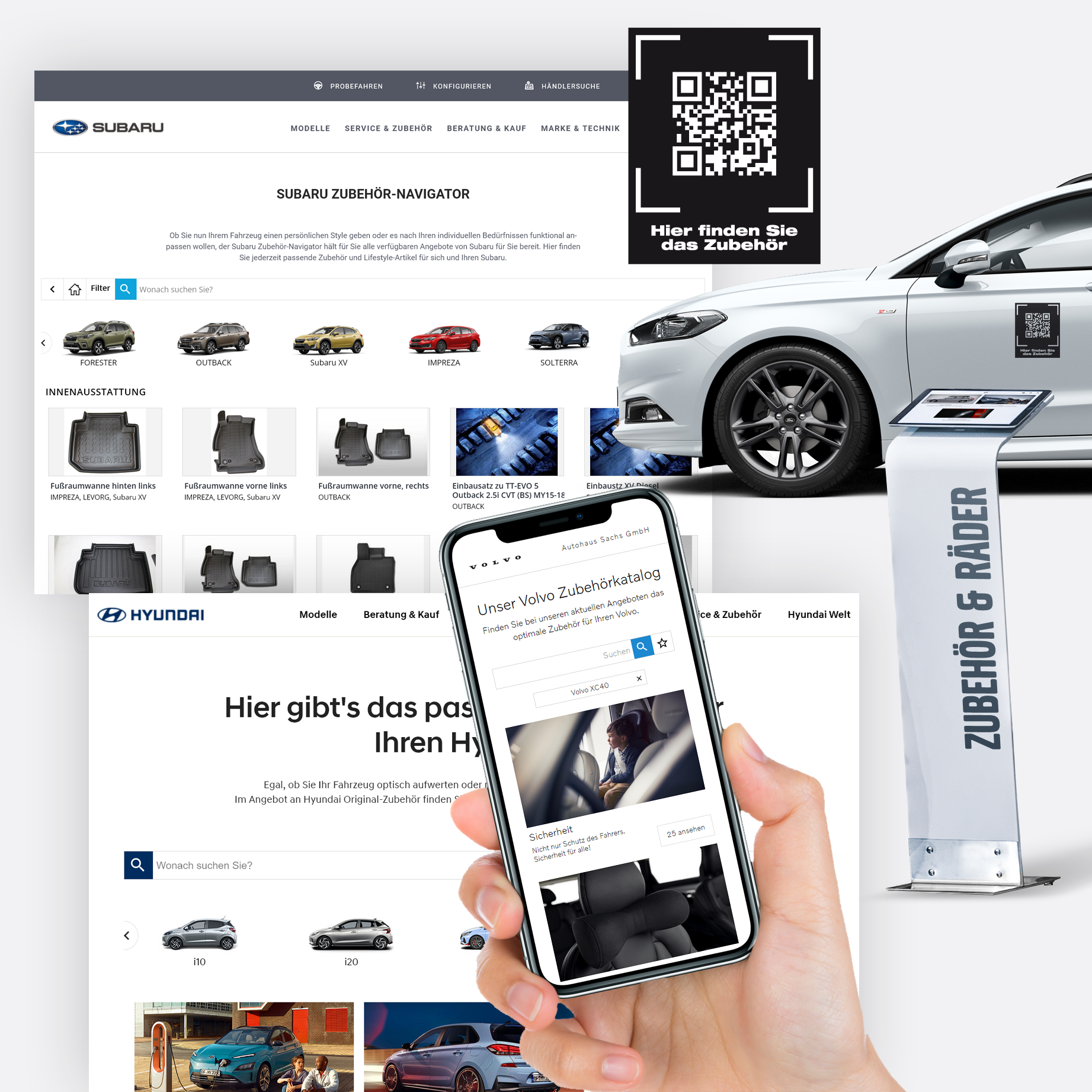Integration des Zubehörs in jede beliebige Website, z.B. auf der Hersteller- bzw. Importeurs-Website, auf der Website einer Autohausgruppe mit mehreren Standorten und Marken oder auf der Website eines einzelnen Autohauses mit einer oder mehreren Marken. -